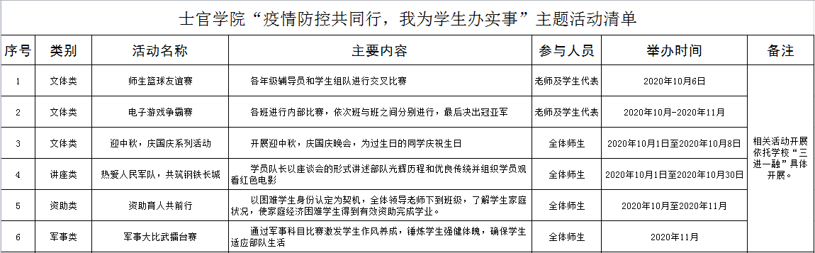 自秋季开学以来,学校实行封闭管理,有效保障了师生员工的身体健康和生命安全。士官学院在学校疫情防控工作领导小组的统一领导下,认真统筹安排,严格按照疫情防控要求,时刻把学生的生命安全放在第一位。目前学院各项工作稳步推进,师生状态良好。为了进一步贯彻落实学校疫情防控领导小组关于开展“疫情防控共同行,我为学生办实事”主题活动我院积极谋划,制定以下方案: